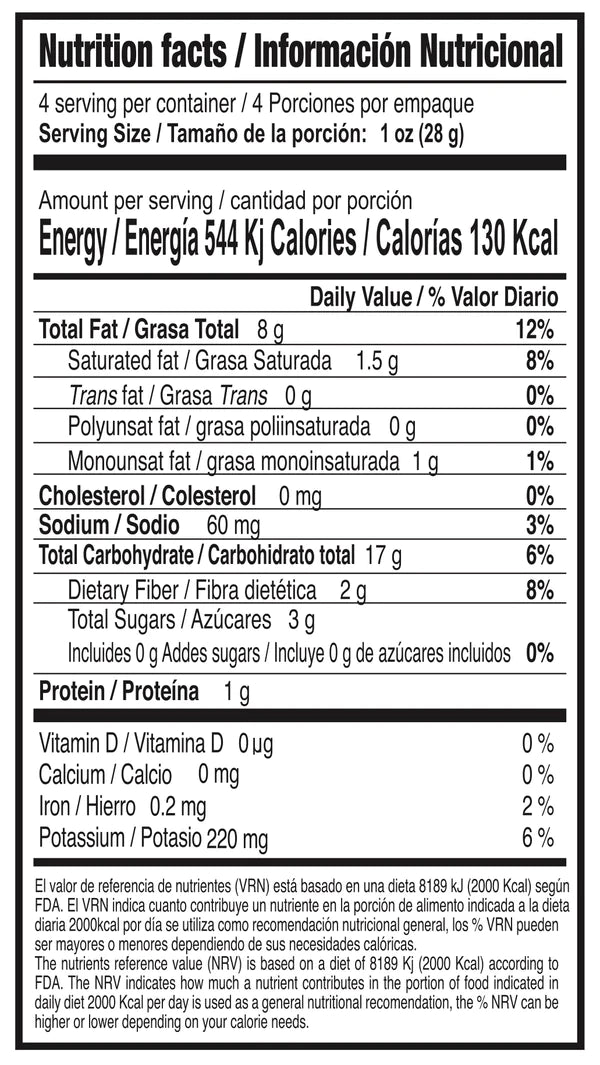 - Ingredientes: plátano maduro, aceite de palma y sal.